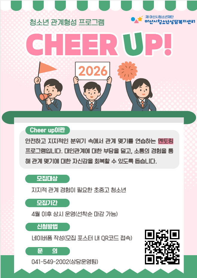 아산시청소년상담복지센터에서는 청소년의 건강한 또래관계 형성과 사회성 향상을 지원하기 위해 'Cheer up' 프로그램 참여자를 모집합니다.