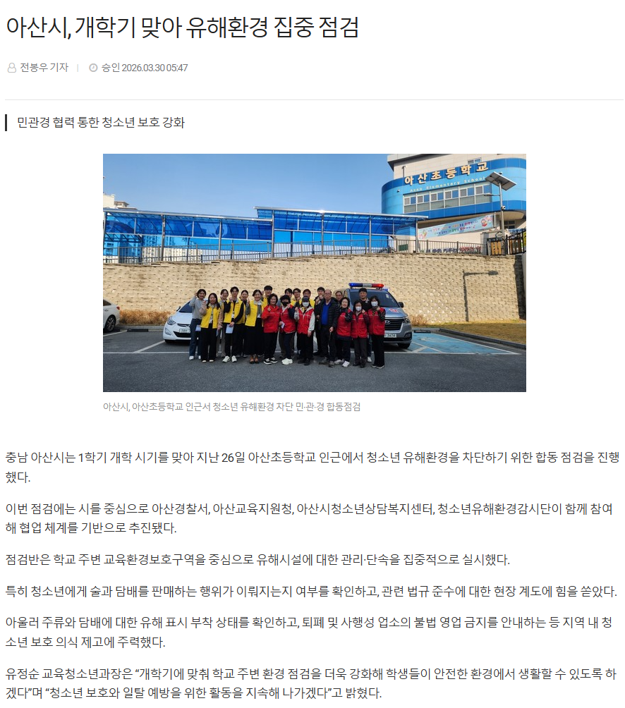 [보도자료] 아산시, 개학기 맞아 유해환경 집중 점검