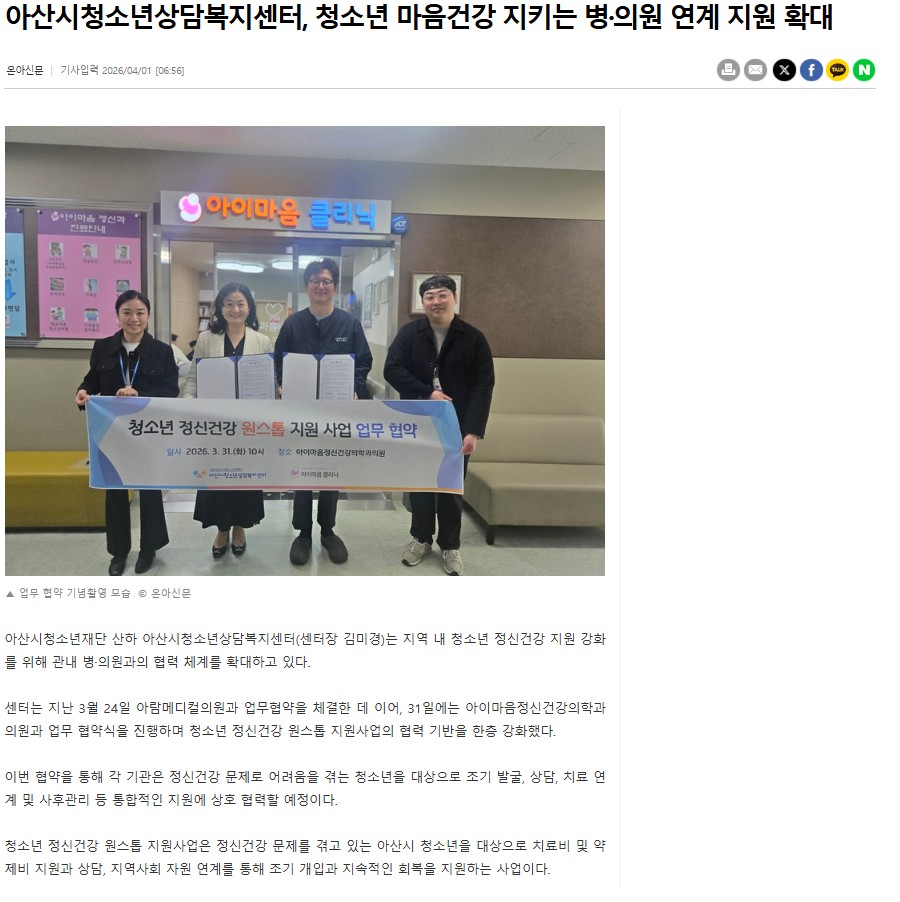 [보도자료] 아산시청소년상담복지센터, 청소년 마음건강 지키는 병·의원 연계 지원 ...