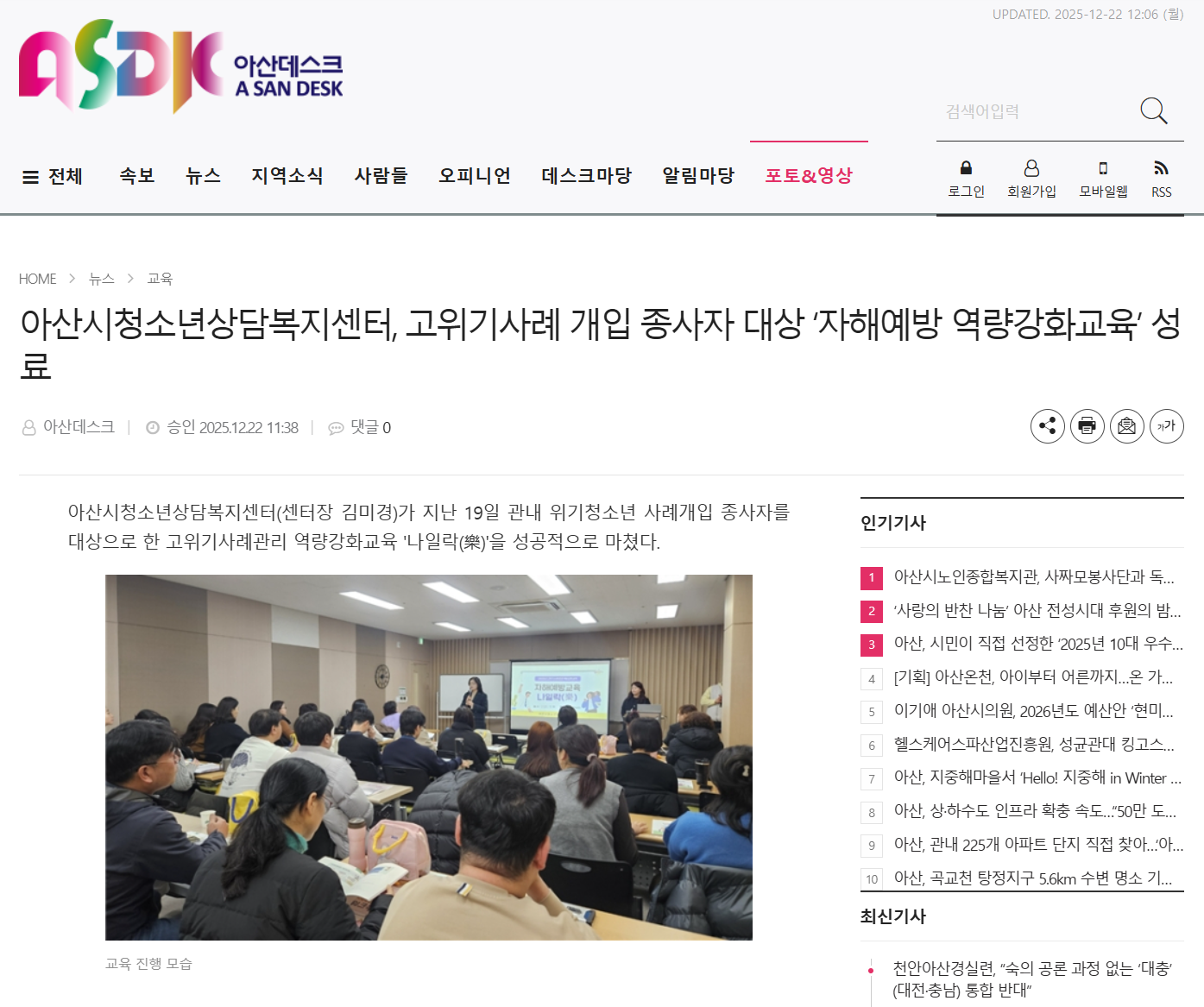 [보도자료] 아산시청소년상담복지센터, 고위기사례 개입 종사자 대상 ‘자해예방 역량강화...
